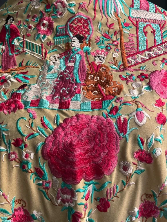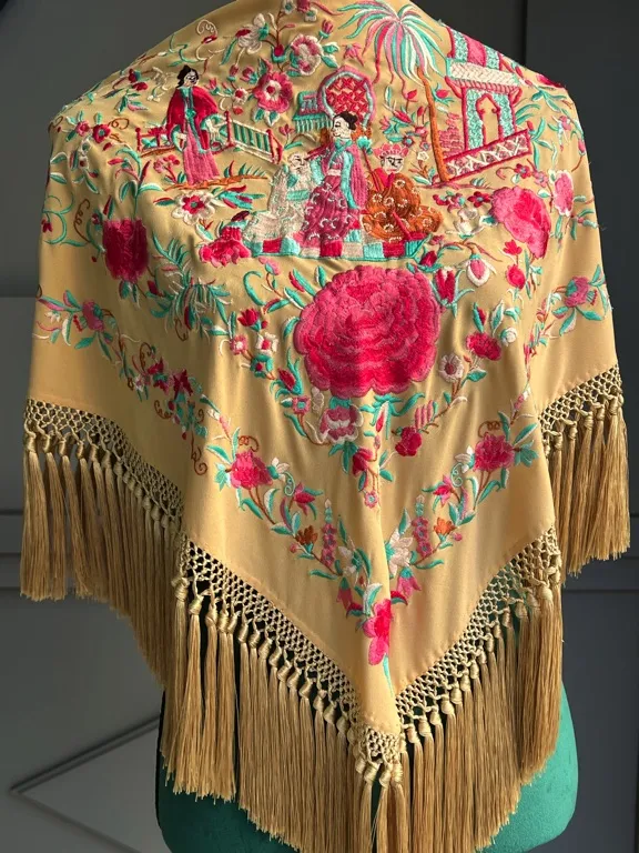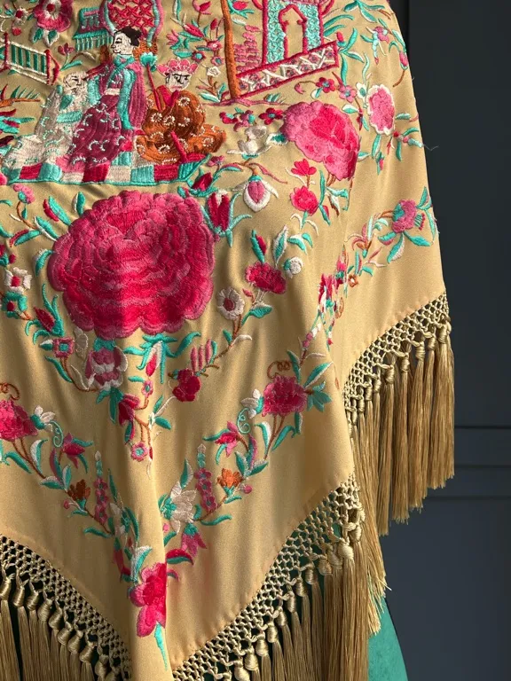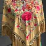 Si hablamos de alta calidad, sólo podemos hablar de este mantón: delicado bordado a máquina con enrejado de flecos en seda hecho por manos artesanas.