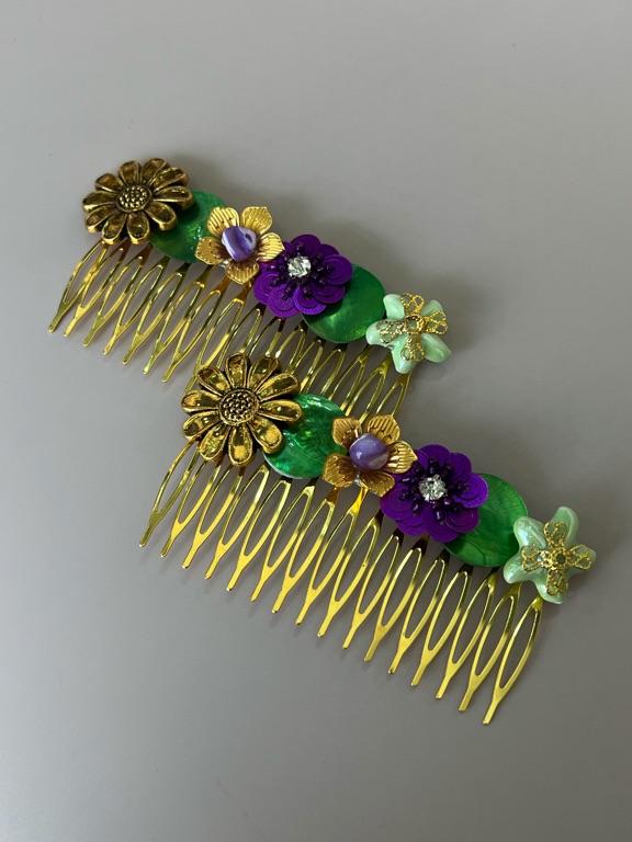 Inspirado en la naturaleza, el peinecillo Fiorella esmeralda es una pieza única que mezcla tonos verdes, lilas y dorado envejecido. Cada detalle floral ha sido creado a mano para aportar frescura y elegancia. Una joya perfecta para destacar tu estilo.