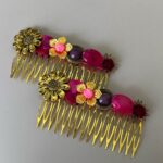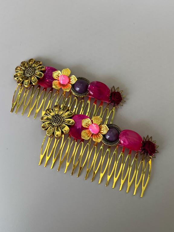 El peinecillo Fiorella fucsia combina el poder del color fucsia con el romanticismo de las flores doradas. Perfecto para dar un toque vibrante y femenino a tu peinado, ya sea en una fiesta, feria o celebración elegante. Hecho a mano con detalles únicos que lo hacen resaltar.
